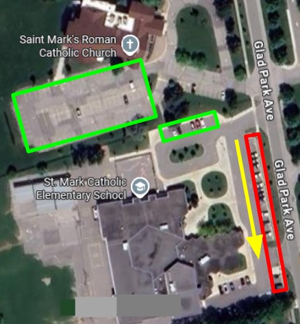 – please use the parking spots on the north side (beside the loop) or the church parking lot (green areas)