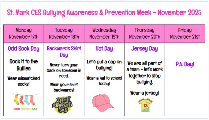 > Bullying Awareness and Prevention Week; staff and students are invited to participate in our spirit week theme days shown below