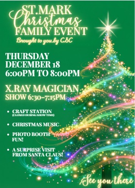 – Family Christmas Event in gymnasium, 6:00-8:00pm, hosted by St. Mark’s Catholic School Council