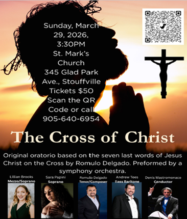 St. Mark’s Parish will proudly present “The Cross of Christ,” an original oratorio based on the seven last words of Christ on the cross performed by a symphony orchestra. This sacred musical work written for four operatic voices and orchestra, was entirely composed, by Romulo Delgado, one of Canada’s top tenors, region finalist at the Hans Gabor Belvedere International Opera competition in Vienna, Austria. Tenor Romulo Delgado will perform his original work along with the following guest artists: Andrew Tees (bass-baritone), Sara Papini (soprano) and Lillian Brooks (mezzo-soprano).